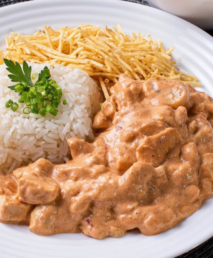 Arroz , Batata , Batata Palha e Strogonoff de Frango